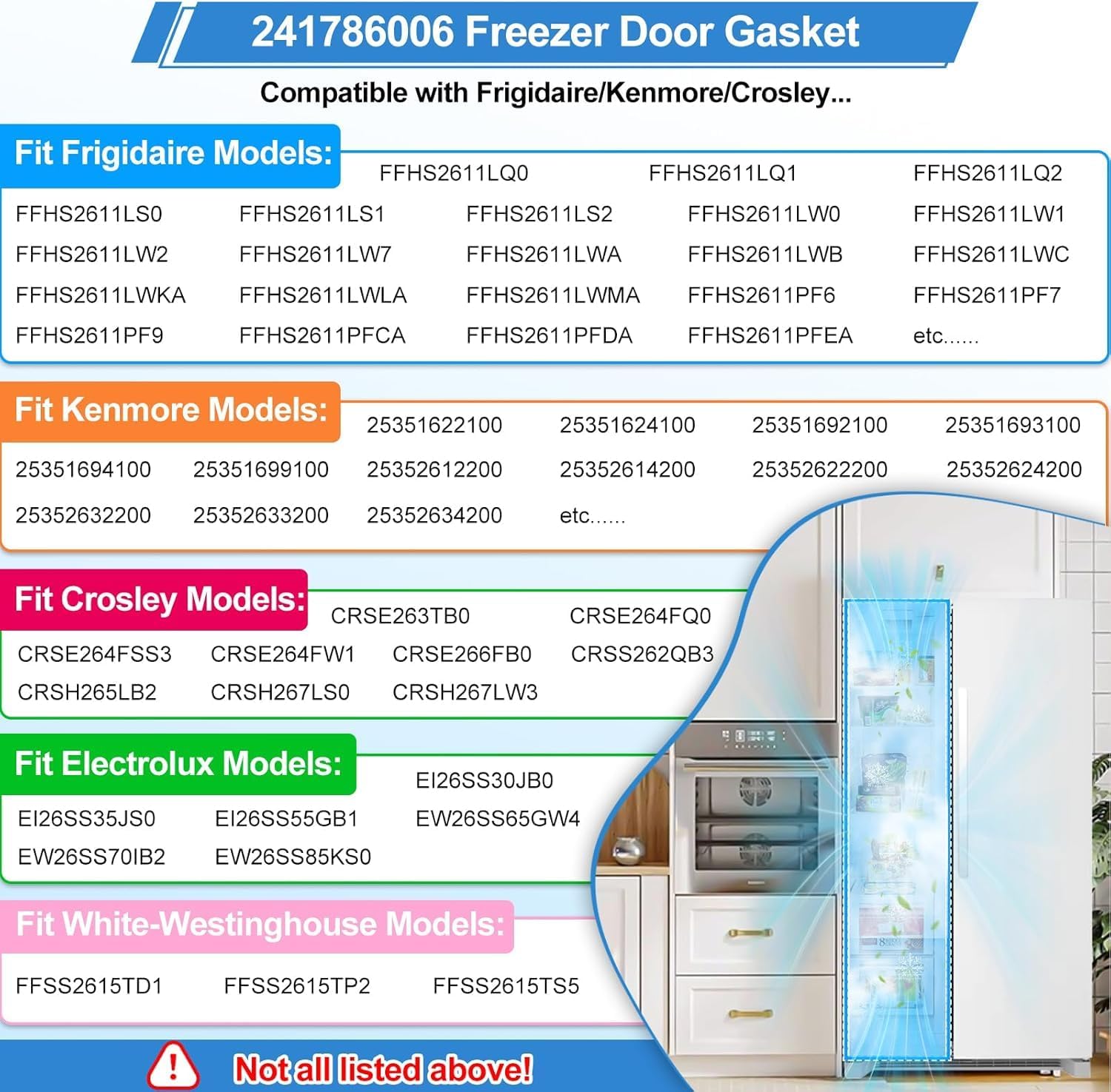 Package: 1 X 241786006 gasket seal for Frigidaire door seal replacement & 10 X strong refrigerator magnets. 365-Days warranty. This 241786006 freezer door gasket For Frigidaire Refrigerator door gasket parts with precise dimensions(14.5" x 63"), replace part numbers: 241786006, 7241786006, 241786002, 7241786002, 240390602, 240390606, 241569802, 241569806, 241674802, 241674806, 241786010, 5304439528, 5304439532, 5304448624, 5304448628, 4993983, OEM29001522. This Frigidaire door gasket 241786006 is suitable for LEFT Freezer door gasket of the Frigidaire/Kenmore refrigerator door, providing an effective seal around the door to prevent warm air from entering the fridge. High-grade silicone resists cracking even at -22°F/-30°C, lasting 3X longer than standard rubber seals. The 241786006 refrigerator gasket replacement Compatible with Frigidaire Crosley Electrolux White-Westinghouse Kenmore refrigerator door gasket, Fit models: FFHS2611LQ0, FFHS2611LQ1, FFHS2611LQ2, FFHS2611LB7, FFHS2611LB8, FFHS2611LB9, FFHS2611LBA, FFHS2611LBB, FFHS2611LBC, FFHS2611LW7, FFHS2611LW8, FFHS2611LWA, FFHS2611LWB, FFHS2611LWC, FFHS2611LWF, FFHS2611LWLA, FFHS2611LWMA, FFHS2611PFDA, FFHS2611PFEA, FFHS2611PFCA, FFHS2611LBLA, FFHS2611LBPA, FFHS2611LBRA, FFHS2622MB0, FFHS2622MBG, FFHS2622MBH, FFHS2622MBNA, FFSS2614QS1A, FFSS2614QS2A, FFSS2614QS6A, FFSS2615TE0, FFSS2615TE4, FFSS2615TS0, 25351624100, 25351692100, 25351693100, CRSE263TB0, CRSE264FSS0, CRSE264FW0 etc. Frigidaire Refrigerator Door Gasket Seal fit models: BFHS2611LM0 BFHS2611LM1 BFHS2611LM2 BGHS2634KE0 BGHS2634KE1 BGHS2634KE2 BGHS2634KP0 BGHS2634KP1 BGHS2634KP2 BGHS2644KF0 BGHS2644KF1 BGHS2644KF2 DGHS2634KB0 DGHS2634KB2 DGHS2634KB3 DGHS2634KE1 DGHS2634KE2 DGHS2634KE3 DGHS2634KP1 DGHS2634KP2 DGHS2634KP3 DGHS2634KW0 DGHS2634KW2 DGHS2634KW3 DGHS2644KF1 DGHS2644KF2 DGHS2644KF3 DGHS2665KF0 DGHS2665KF2 DGHX2655TF0 DGHX2655TF5 DGHX2655TF6 DGHX2655TF8 DGHX2655TF9 DGHX2655TFA DGHX2655TFB DGHX2655TFC DGUS2635LE0 DGUS2635LE1 DGUS2635LE2 DGUS2635LP0 DGUS2635LP1 DGUS2635LP2 DGUS2645LF0 DGUS2645LF2 DGUS2645LF3 DGUS2645LF4 DGUS2645LF5 DGUS2645LF6A FFHS2611LB0 FFHS2611LB1 FFHS2611LB2 FFHS2611LB4 FFHS2611LB5 FFHS2611LB6 FFHS2611LB7 FFHS2611LB8 FFHS2611LB9 FFHS2611LBA FFHS2611LBB FFHS2611LBC FFHS2611LBD FFHS2611LBE FFHS2611LBF FFHS2611LBG FFHS2611LBH FFHS2611LBJ FFHS2611LBK FFHS2611LBLA FFHS2611LBMA FFHS2611LBNA FFHS2611LBPA FFHS2611LBRA FFHS2611LQ0 FFHS2611LQ1 FFHS2611LQ2 FFHS2611LS0 FFHS2611LS1 FFHS2611LS2 FFHS2611LW0 FFHS2611LW1 FFHS2611LW2 FFHS2611LW4 FFHS2611LW5 FFHS2611LW6 FFHS2611LW7 FFHS2611LW8 FFHS2611LWA FFHS2611LWB FFHS2611LWC FFHS2611LWD FFHS2611LWE FFHS2611LWF FFHS2611LWG FFHS2611LWHA FFHS2611LWJA FFHS2611LWKA FFHS2611LWLA FFHS2611LWMA FFHS2611PF0 FFHS2611PF1 FFHS2611PF2 FFHS2611PF4 FFHS2611PF5 FFHS2611PF6 FFHS2611PF7 FFHS2611PF9 FFHS2611PFAA FFHS2611PFBA FFHS2611PFCA FFHS2611PFDA FFHS2611PFEA FFHS2612LS0 FFHS2612LS1 FFHS2612LS2 FFHS2612LS4 FFHS2612LS5 FFHS2612LS6 FFHS2612LS7 FFHS2612LS8 FFHS2612LSB FFHS2612LSD FFHS2612LSE FFHS2622MB0 FFHS2622MB1 FFHS2622MB2 FFHS2622MB3 FFHS2622MB4 FFHS2622MB5 FFHS2622MB7 FFHS2622MB8 FFHS2622MB9 FFHS2622MBA FFHS2622MBB FFHS2622MBC FFHS2622MBD FFHS2622MBE FFHS2622MBF FFHS2622MBG FFHS2622MBH FFHS2622MBJ FFHS2622MBL FFHS2622MBMA FFHS2622MBNA FFHS2622MBPA FFHS2622MBQA FFHS2622MH0 FFHS2622MH1 FFHS2622MH2 FFHS2622MH3 FFHS2622MH5 FFHS2622MH6 FFHS2622MH8 FFHS2622MH9 FFHS2622MHA FFHS2622MHB FFHS2622MHE FFHS2622MHF FFHS2622MHH FFHS2622MM0 FFHS2622MM1 FFHS2622MM2 FFHS2622MM3 FFHS2622MM5 FFHS2622MM6 FFHS2622MM7 FFHS2622MM8 FFHS2622MM9 FFHS2622MMA FFHS2622MMB FFHS2622MMD FFHS2622MME FFHS2622MMF FFHS2622MMH FFHS2622MQ0 FFHS2622MQ1 FFHS2622MQ2 FFHS2622MQ3 FFHS2622MQ5 FFHS2622MQA FFHS2622MQB FFHS2622MQC FFHS2622MQD FFHS2622MQF FFHS2622MQG FFHS2622MQJ FFHS2622MS0 FFHS2622MS1 FFHS2622MS2 FFHS2622MS3 FFHS2622MS4 FFHS2622MS5 FFHS2622MS7 FFHS2622MS8 FFHS2622MS9 FFHS2622MSA FFHS2622MSB FFHS2622MSC FFHS2622MSE FFHS2622MSF FFHS2622MSG FFHS2622MSH FFHS2622MSJ FFHS2622MSL FFHS2622MSM FFHS2622MSN FFHS2622MSP FFHS2622MSQ FFHS2622MSR FFHS2622MSS FFHS2622MST FFHS2622MSU FFHS2622MSVA FFHS2622MSWA FFHS2622MSXA FFHS2622MSYA FFHS2622MSZA FFHS2622MW0 FFHS2622MW1 FFHS2622MW2 FFHS2622MW3 FFHS2622MW4 FFHS2622MW5 FFHS2622MW8 FFHS2622MWA FFHS2622MWB FFHS2622MWC FFHS2622MWD FFHS2622MWF FFHS2622MWG FFHS2622MWJ FFHS2622MWKA FFHS2622MWLA FFHS2622MWMA FFHS2622MWNA FFHS2624LE0 FFHS2624LM0 FFHS2624LP0 FFHS2624LS0 FFHS2626LE0 FFHS2626LP0 FFHS2626LS0 FFSS2614QE0 FFSS2614QE1A FFSS2614QE2A FFSS2614QE3A FFSS2614QE4A FFSS2614QE5A FFSS2614QE6A FFSS2614QP0 FFSS2614QP1A FFSS2614QP2A FFSS2614QP3A FFSS2614QP4A FFSS2614QP5A FFSS2614QP6A FFSS2614QS0 FFSS2614QS1A FFSS2614QS2A FFSS2614QS3A FFSS2614QS4A FFSS2614QS5A FFSS2614QS6A FFSS2614QS7A FFSS2615TD0 FFSS2615TD1 FFSS2615TD2 FFSS2615TD3 FFSS2615TD4 FFSS2615TE0 FFSS2615TE1 FFSS2615TE2 FFSS2615TE3 FFSS2615TE4 FFSS2615TP0 FFSS2615TP1 FFSS2615TP2 FFSS2615TP3 FFSS2615TP4 FFSS2615TS0 FFSS2615TS1 FFSS2615TS2 FFSS2615TS3 FFSS2615TS5 FFSS2618SS0 FFSS2622NB0 FFSS2622NB2 FFSS2622NB3 FFSS2622NB4 FFSS2622NB5 FFSS2622NS0 FFSS2622NS2 FFSS2622NS3 FFSS2622NS4 FFSS2622NS5 etc Kenmore Refrigerator Door Gasket Seal fit models: 25351622100 25351622101 25351622102 25351622103 25351622104 25351624100 25351624101 25351624102 25351624103 25351624104 25351692100 25351692101 25351692102 25351692103 25351692104 25351692105 25351693100 25351693101 25351693102 25351693103 25351693104 25351693105 25351693106 25351694100 25351694101 25351694102 25351694103 25351694104 25351694105 25351699100 25351699101 25351699102 25351699103 25351699104 25351699105 25352612200 25352612201 25352612202 25352614200 25352614201 25352614202 25352622200 25352622201 25352622202 25352624200 25352624201 25352624202 25352632200 25352632201 25352632202 25352633200 25352634200 25352634201 25352634202 25352639200 25352639201 25352639202 25352642300 25352642301 25352642302 25352642304 25352644300 25352644301 25352644302 25352644303 25352644304 25352649300 25352649301 25352649302 25352649303 253526