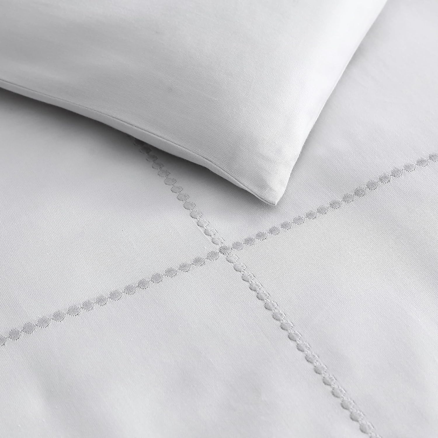 The Vera Wang Simple Fot Duvet Covet Set is a classic ensemble with a luxury hotel sensibility, a minimal modern aesthetic and maximum style. The purity of silky soft, light grey cotton sateen becomes a blank canvas for the tailored continuos dot embroidery that accent each bed component. The light grey running dot stitch technique adds subtle and sophisticated dressmaker detailing that reflect the designer's signature style. The duvet cover features a button closure and additional inner ties to keep your insert in place and the duvet insert is sold separately. The shams feature a 2-piece back closure for easy removal. Made in high quality cotton, this set is the perfect piece to create a unique and on-trend bedroom look. The set includes 1 duvet cover and 2 shams and the ensemble is machine washable for easy care.