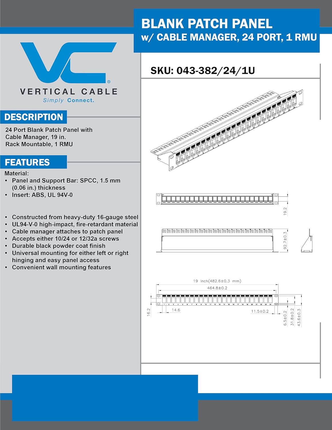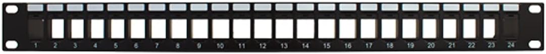 Vertical Cable 24 Port Blank 1-U Patch Panel is designed to be used with high-density keystone jacks. It is constructed from 16-gauge steel and UL94-V-0 high-impact, fire-retardant material, and protected with durable black powder coat finish. This patch panel accepts either 10/24 or 12/32 screws. Please note that Bezels, Jacks or Inserts NOT Included.