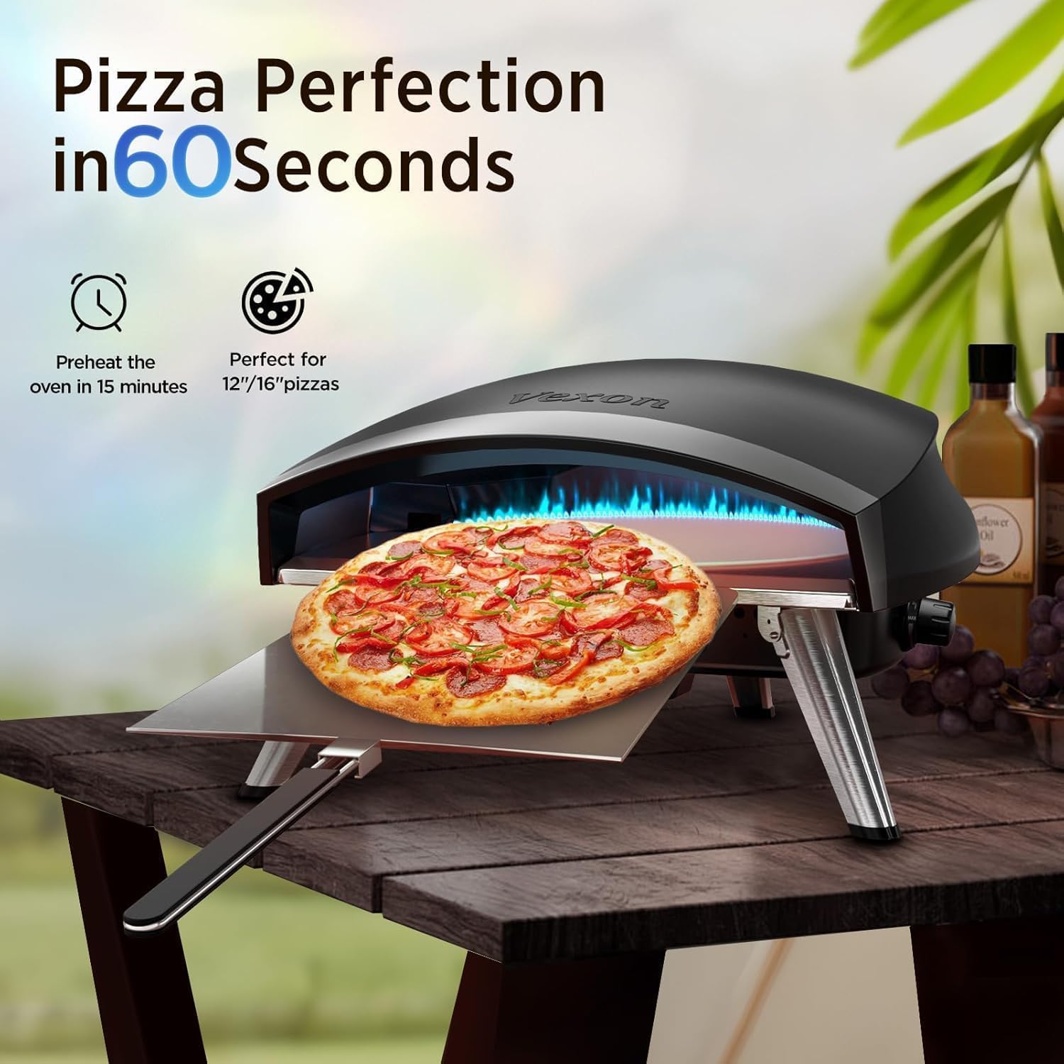 The VEXON 16" Gas Pizza Oven brings authentic, stone-fired pizza to your backyard or campsite. Preheats in 15 minutes and bakes delicious 16-inch pizzas in just 60 seconds with its 360° rotating pizza stone for even cooking. Compact yet powerful, this propane oven is easy to set up and built to handle meats, veggies, and more. With adjustable temperature control and a durable powder-coated body, it’s perfect for outdoor cooking anytime, anywhere.