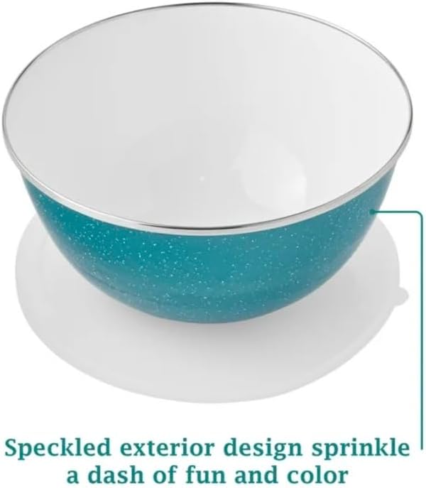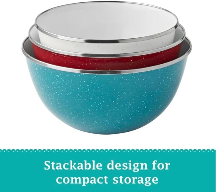 Prep all your favorite foods in style with this vintage-inspired 6-piece enamel-on-steel mixing bowl set with lids. This set includes three different sizes: a 2.4-quart bowl, a 3.3-quart bowl, and a 4-quart bowl. Each bowl is designed to nest inside the other for convenient, space-saving storage. Good Looking and versatile, these vintage-inspired bowls are perfect for mixing ingredients, prepping meals, and even serving dishes directly at the table. Add this 6-piece enamel-on-steel mixing bowl set with lids to your kitchen collection today.