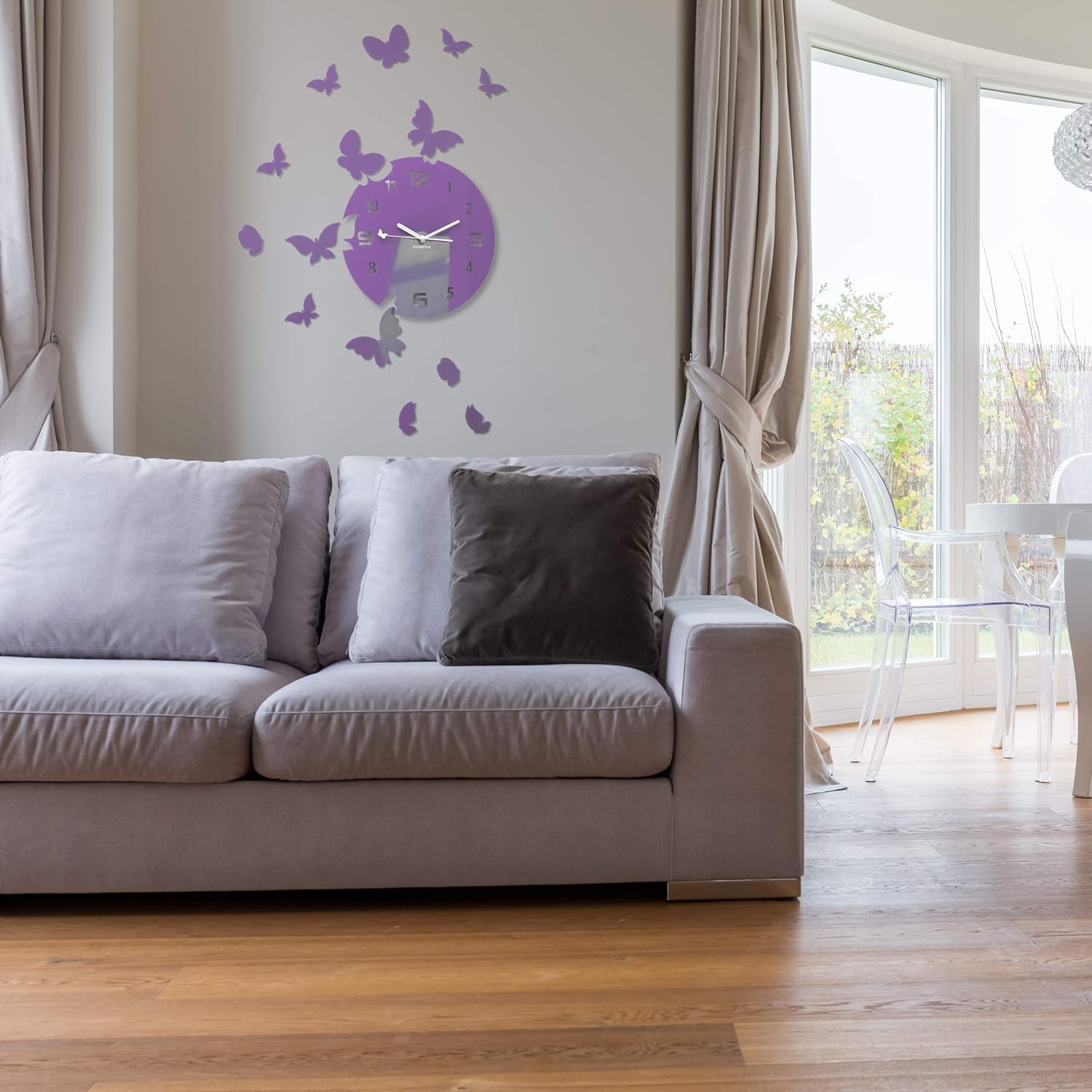 Large modern wall clock butterfly round 30 cm. FLEXISTYLE Large Modern Wall Clock Butterfly Round 30 cm 15 Butterflies Living Room Bedroom Children's Room Product Made in the EU (Purple (Milka))