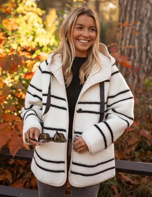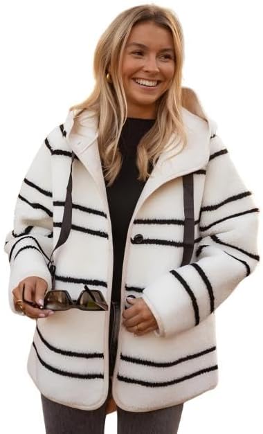 Stay warm and stylish this season with this women's hooded striped sherpa jacket. Featuring a classic white base with bold black horizontal stripes, this cozy fleece jacket combines comfort with contemporary design. The soft sherpa material provides exceptional warmth, making it perfect for chilly autumn days and cool winter evenings. The relaxed, oversized fit ensures easy layering over your favorite sweaters or casual tops, while the button-front closure allows for versatile styling options. A functional hood adds extra protection from the elements and enhances the jacket's casual-chic appeal. The striped pattern creates a timeless nautical-inspired look that pairs effortlessly with jeans, leggings, or casual pants. Whether you're running errands, meeting friends for coffee, or enjoying outdoor activities, this versatile sherpa jacket delivers both functionality and fashion-forward style that will keep you comfortable throughout the cooler months.