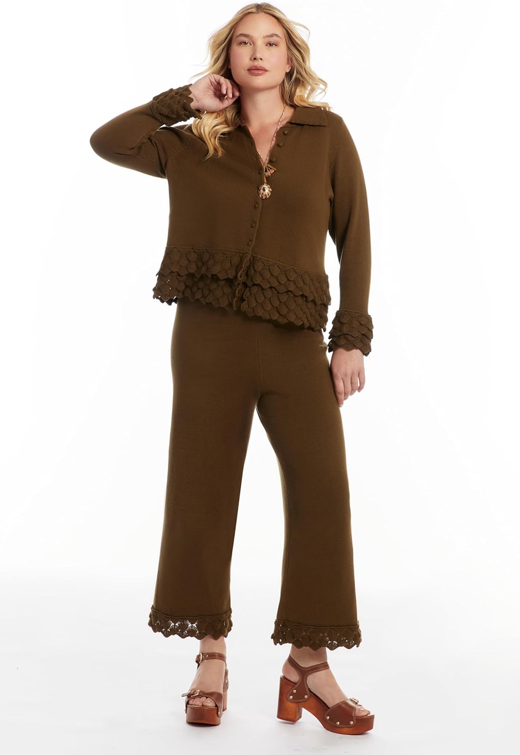 As charming as a handwritten letter, this ruffle-detail peplum cardigan is rich in nostalgia—thanks especially to its oversized collar, sculpted sleeves, and gentle flare tracing each movement with quiet confidence. STYLE NOTES Oversized collar br> Functional front button placket br> Close fit with peplum hem br> Hits high at the hip br> Body length is 23" on size 18/20 FABRIC & CARE Stretch sweater yarn br> 51% Rayon/23% Nylon/26% Polyester br> Machine wash cold gentle cycle with like colors. Only non-chlorine bleach when needed. Do not tumble dry. Lay flat to dry. Cool iron as needed.
