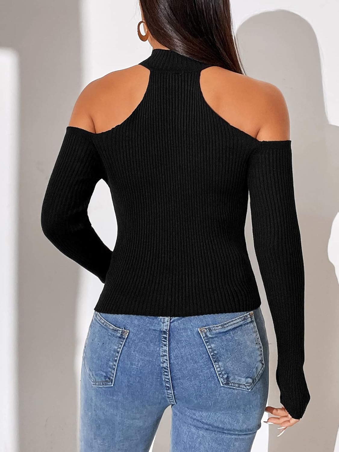 XSBicep Length : 6.5 inchBust : 21.7 inchCuff : 4.7 inchLength : 16.3 inchSleeve Length : 19.9 inchSBicep Length : 7.1 inchBust : 23.2 inchCuff : 5.1 inchLength : 16.7 inchSleeve Length : 20.3 inchMBicep Length : 7.6 inchBust : 24.8 inchCuff : 5.5 inchLength : 17.1 inchSleeve Length : 20.7 inchLBicep Length : 8.4 inchBust : 27.2 inchCuff : 6 inchLength : 17.7 inchSleeve Length : 21.1 inchQuantity: 1 pieceColor: BlackStyle: CasualPattern Type: PlainDetails: Rib-KnitType: PulloversNeckline: Cold ShoulderSleeve Length: Long SleeveSleeve Type: Regular SleeveLength: RegularFit Type: Slim FitFabric: High StretchMaterial: ViscoseComposition: 72% Viscose,28% NylonCare Instructions: Hand wash or professional dry cleanSheer: No