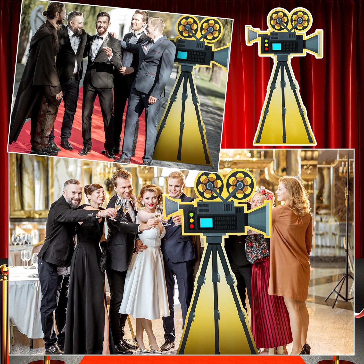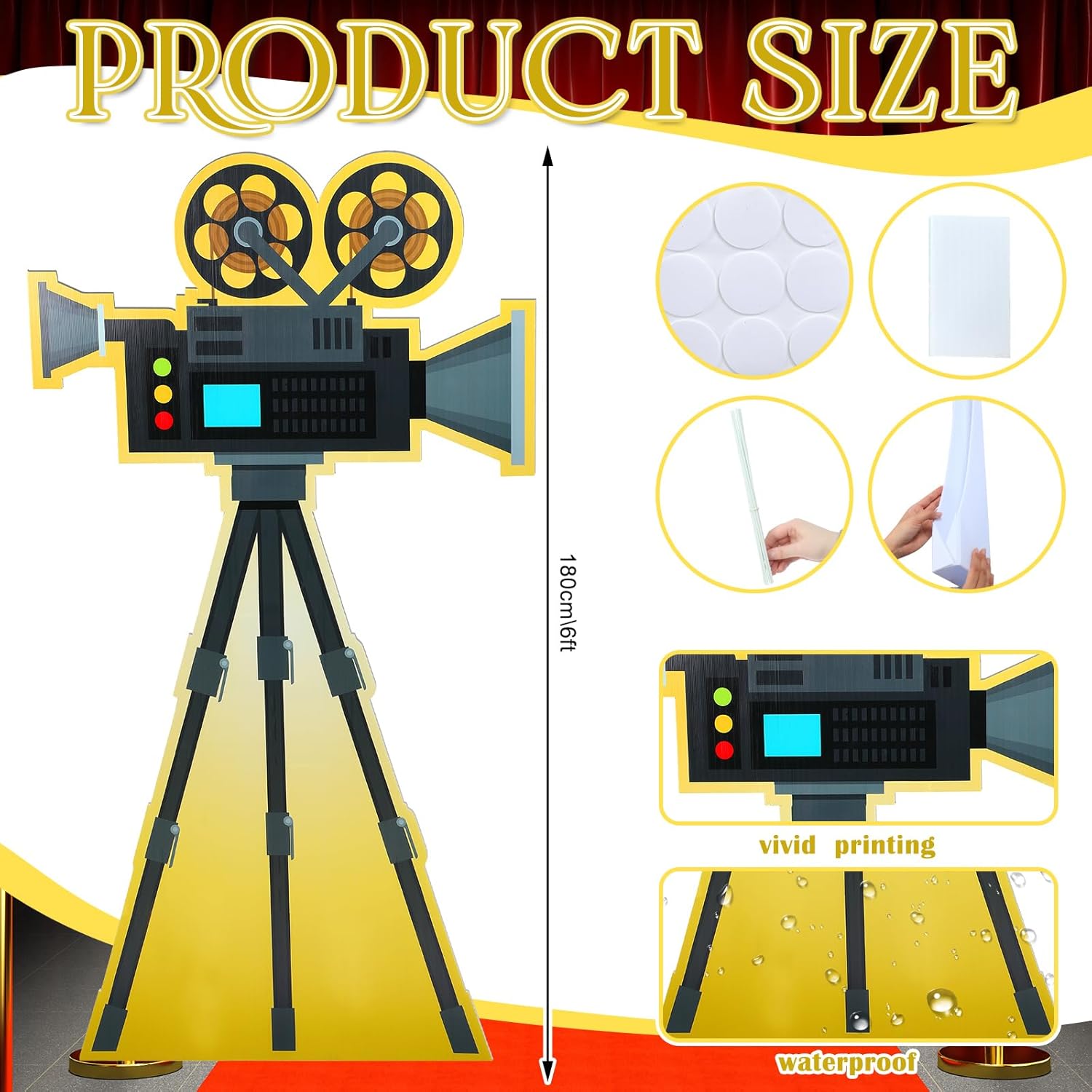 Features: Professional -grade stability: With a reinforced folding stand and lightweight, durable construction, this gold camera stand ensures your large red carpet camera stays upright throughout your event. Reusable party essentials: Made of materials, this red carpet camera stand display decoration can be applied multiple times year after year, making it a smart investment for event planners, schools, and party lovers who love themed celebrations. Specifications: Main Material: PVC Color: colorful Size: 6 feet tall Package Included: 1 x Red Carpet Camera Stand Notes: Due to manual measurement, there may be a little error in size. Colors may vary slightly due to different screen displays.