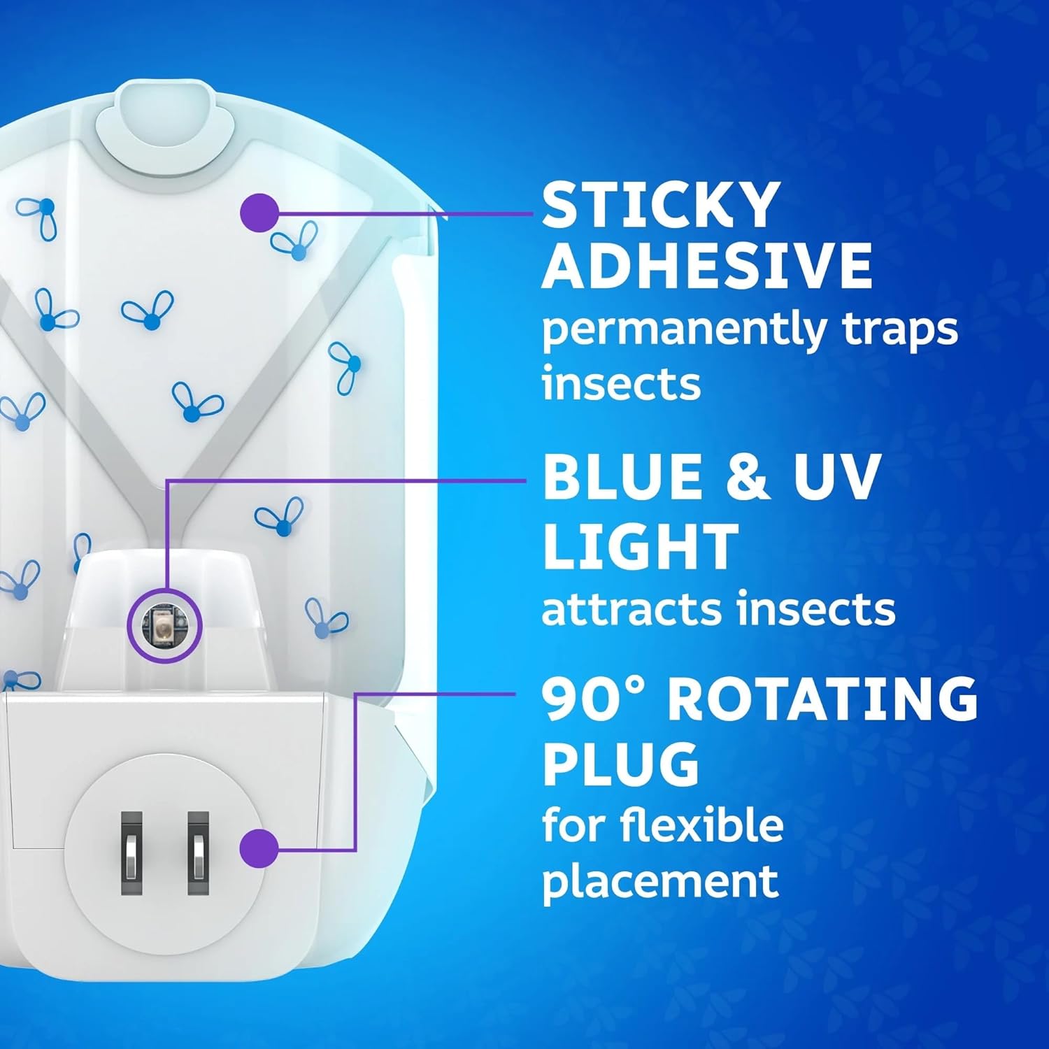 The Zevo Indoor fly trap attracts flying insects (houseflies, fruit flies, and gnats) with specially designed blue and UV LEDs. Captures flying insects onto an adhesive backing that you never have to touch. Use throughout your home in kitchens, bathrooms, garages, living spaces, or near sources of food such as fruit bowls, trash cans, doors, house plants, etc., for 24/7 continuous attraction. 2 Device & 6 Cartridge.
